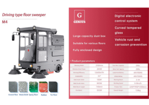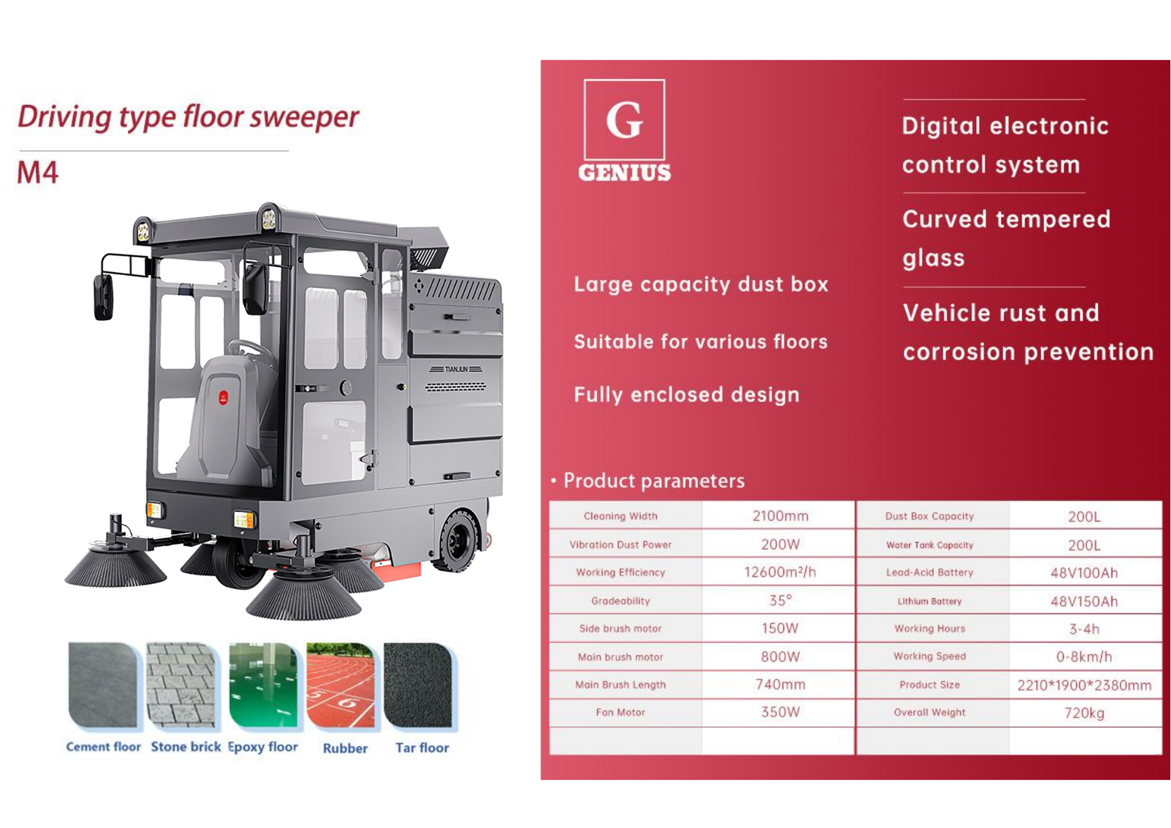 The Genius M4 is a high-performance, fully-enclosed industrial sweeper. Its design prioritizes operator comfort and protection (fully enclosed cab, curved tempered glass) while delivering superior sweeping efficiency, making it the top choice for cleaning in dusty, harsh, or weather-exposed environments.