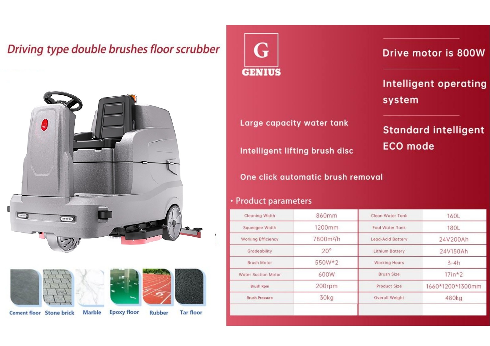 | Machine Features | Intelligent Lifting Brush Disc One Click Automatic Brush Removal Intelligent Operating System Standard Intelligent ECO Mode Double Brush Design Large Capacity Water Tank Integrated Cast Aluminum Chassis Cast Aluminum Brush Disc Cover |